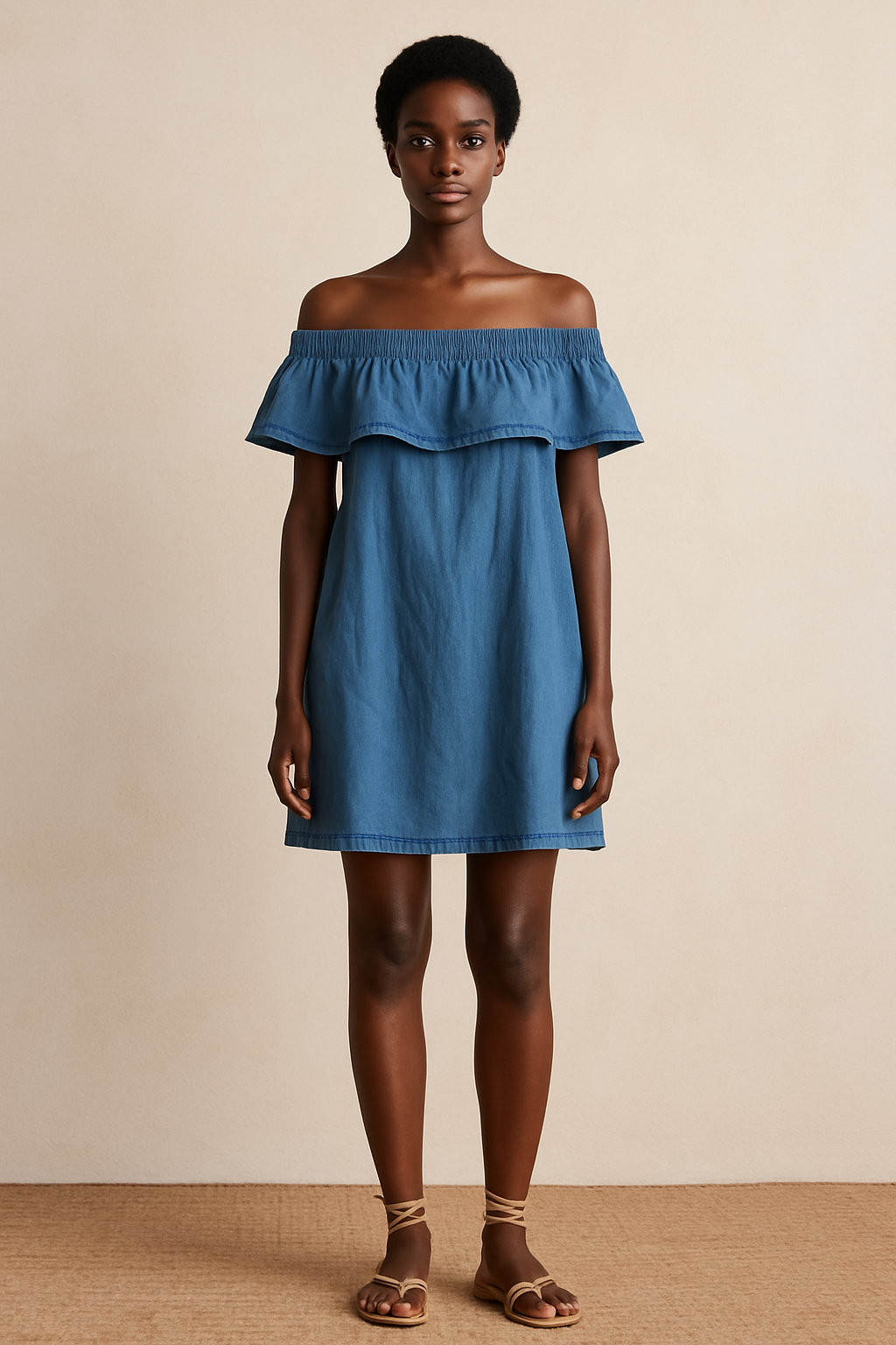 Son col bardot à volants dévoile élégamment les épaules, ajoutant une touche de féminité et de fraîcheur à ta silhouette. Sa coupe légèrement ample et courte s’adapte à toutes les morphologies pour un confort optimal.